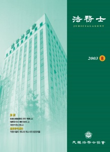 2003 8 CONTENTS 4 18 33 51 55 58 61 62 65 72 76 69 78 79 70 JUDICIALAGENT 업무참고X匡료 등가선례 대통령령 여1 판결·결정 協會.地方會動靜 法務士登錄公告 ■ 財産分割制度에 관한考察(上) | 崔徵鎬 • 推尋命令과 轉付命令(上) 申 鉉基 채권자취소권(上) | 李相武 ■ ■ 약정 이율의 한도와 제소시의 법정 이율 부동산등기관계 ■ ■ ■ 법 률 제 6925호 제 6926호 대통령령 체 18044호 대법 원등기 예규 제 1072'호 제 107호혼 ■ 대법 원판결 (결정 )요치 특허법원청Ap |전인ILH ■ 특킹법원청사이전 안내 ■ 黃香의 悲歌 | 趙 能來 • 日常生健康守則 | 徐 柄 善 •• 감사(感謝) 불감증 | 姜 正 煥 • 論 說 법 률 규 隨 想